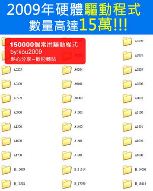 Drivers 2009年驅動程式大補帖 (多達15萬組~桌電~筆電~驅動程式通通吃!)多國語言版 (DVD一片裝) -=-=-=-=-=-=-=-=-=-=-=-=-=-=-=-=-=-=-=-=-=-=-=-=-=-=-=-=-=-=-=-=-=-=-=-= 軟體名稱:Drivers 2009年驅動程式大補帖 (多達15萬組~桌電~筆電~驅動程式通通吃!)多國語言版 (DVD一片裝) 語系版本:多國語言版 光碟片數:單片裝 破解說明: 系統支援:WIN 9x/WIN ME/WIN NT/WIN 2000/WIN XP/WIN 2003 軟體類型:多達15萬組~桌電~筆電~驅動程式通通吃! 硬體需求:PC 更新日期:2009/12/28 官方網站: 中文網站: 軟體簡介: 銷售價格:180 -=-=-=-=-=-=-=-=-=-=-=-=-=-=-=-=-=-=-=-=-=-=-=-=-=-=-=-=-=-=-=-=-=-=-=-= 軟體簡介: Drivers 2009年驅動程式大補帖 (多達15萬組~桌電~筆電~驅動程式通通吃!)多國語言版 【軟體介紹】 15萬個驅動程式 包含各類CPU,主機版,顯示卡,音效卡驅動程式!! 包含ASUS, ACER, SONY, BENQ, LENOVO, DELL各品牌筆記電腦驅動程式!! 桌上型~筆電型的驅動程式通吃啦! 每當User每一次重灌完XP~是不是必須要找出電腦或硬體附帶的光碟片裝 入所需要drivers驅動程式呢? 或者User丟了那些光碟片子,又要去查出主機版和硬體的發展商網站下載 所有的程式回來再安裝,太浪費時間了吧!!! Universal Driver CD內含10萬hardware components from brands包括Dell、 HP/COMPAQ、IBM/LENOVO、SONY、TOSHIBA、PANSONIC...等等,更利害的包 括主機版:Video Card、Sound Card、Lan driver、Modem、From Intel、 AMD、3Com、VIA、Nvidia、ATI、Soundmax...等等的驅動程式唷!User只 要一片本光碟驅動程式一切就都搞定啦!!!(完全不用裝完一個驅動程式又 要重新啟動過電腦再裝另一個驅動程式) 此光碟完全無需安裝,只要到Device Manager找到硬體有黃色問號,更新 驅動程式即可! -=-=-=-=-=-=-=-=-=-=-=-=-=-=-=-=-=-=-=-=-=-=-=-=-=-=-=-=-=-=-=-=-=-=-=-=